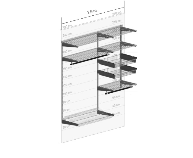 В комплект входят несущие рельсы и навесные направляющие, полки, штанги, аксессуары, крепежные элементы. Можно докупить множество дополнительных компонентов для гардеробной системы.