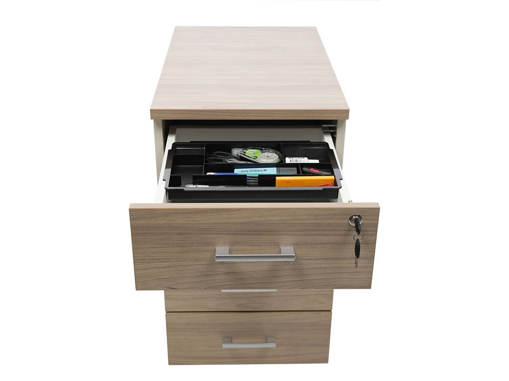 - тумба снабжена центральным замком и оснащена пластмассовым лотком для канцелярских принадлежностей в верхнем ящике