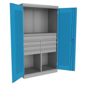 Максимальная распределенная нагрузка на шкаф составляет 400кг. Максимальная равномерно распределённая нагрузка на полку 50кг, выдвижной ящик 40кг. Шкаф оснащен замком «Евролок». Окраска элементов корпуса осуществляется порошковой полимерной краской: RAL 7037 (пыльно-серый), а дверцы RAL 5015 (небесно-синий) – складская программа, RAL 3003 (красный) – под заказ. Все шкафы отгружаются со склада в разобранном виде. Инструкцию по сборке вы можете скачать с нашего сайта.