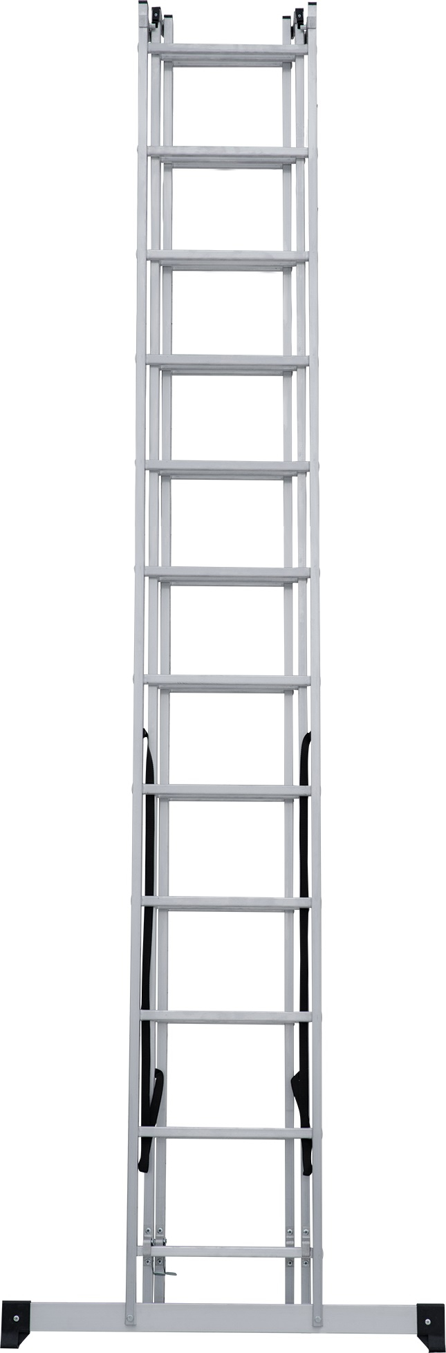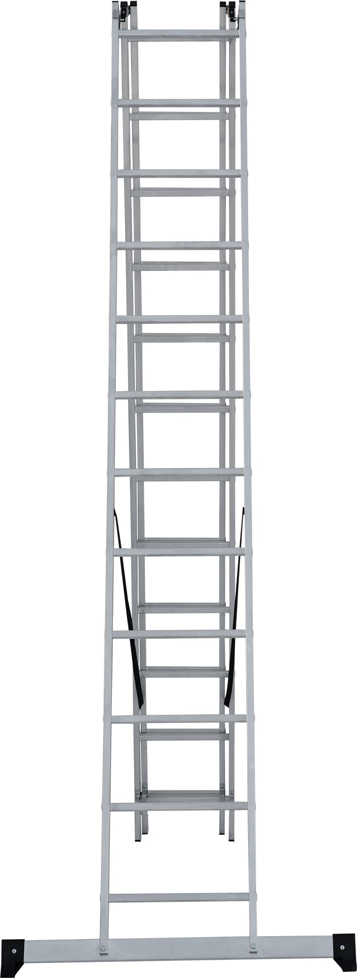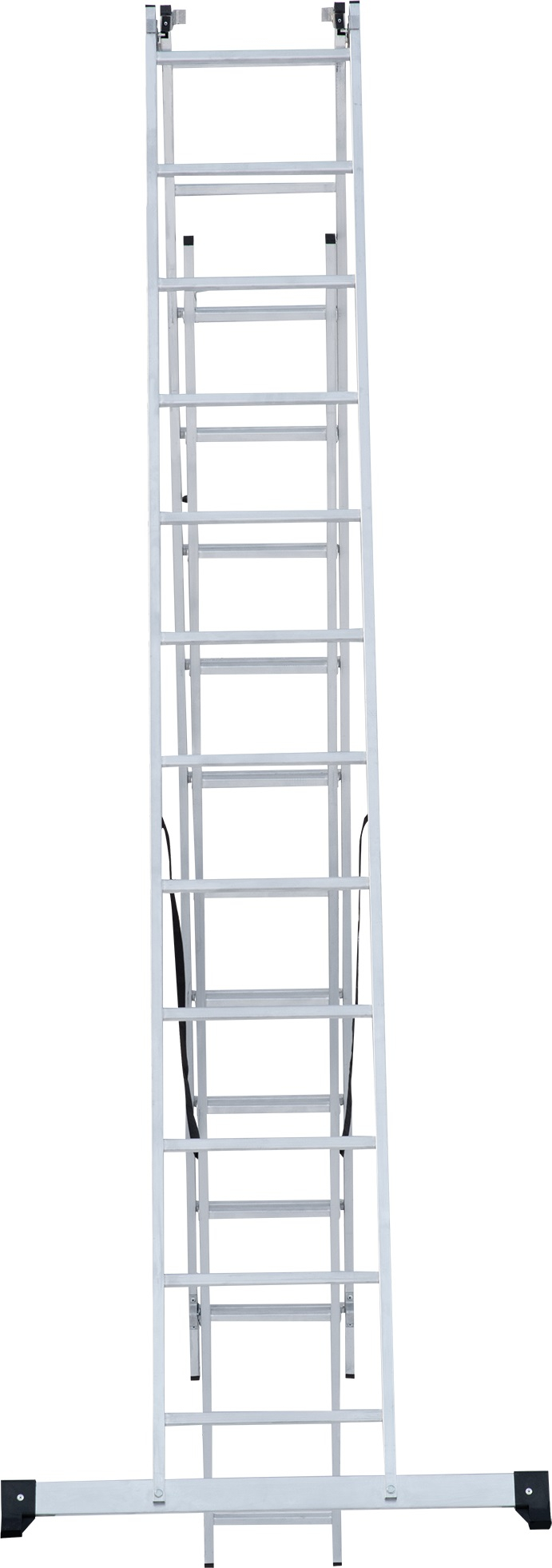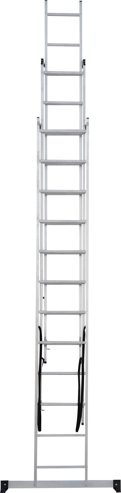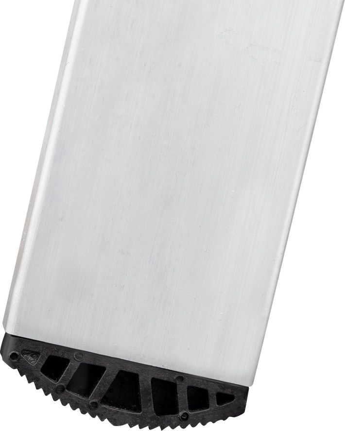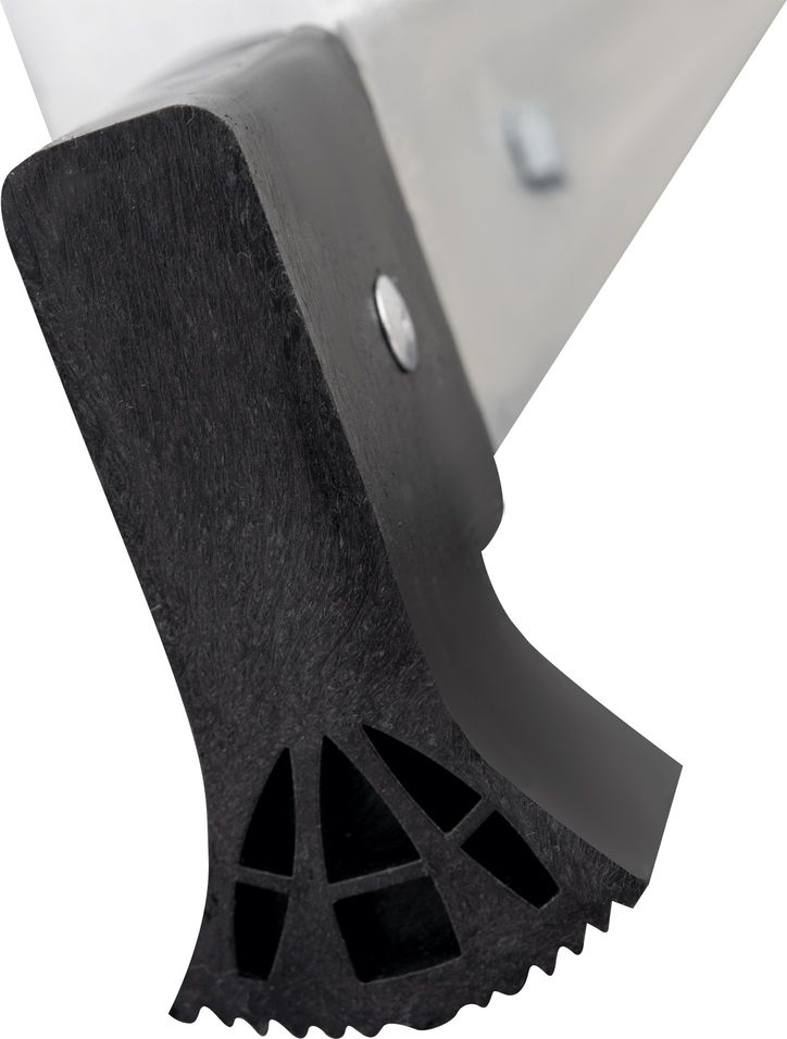 - Усиленная траверса с нескользящими башмаками из 2х-компонентного пластика с прорезиненной опорой (в комплекте поставки для лестниц 3×15–3×17).