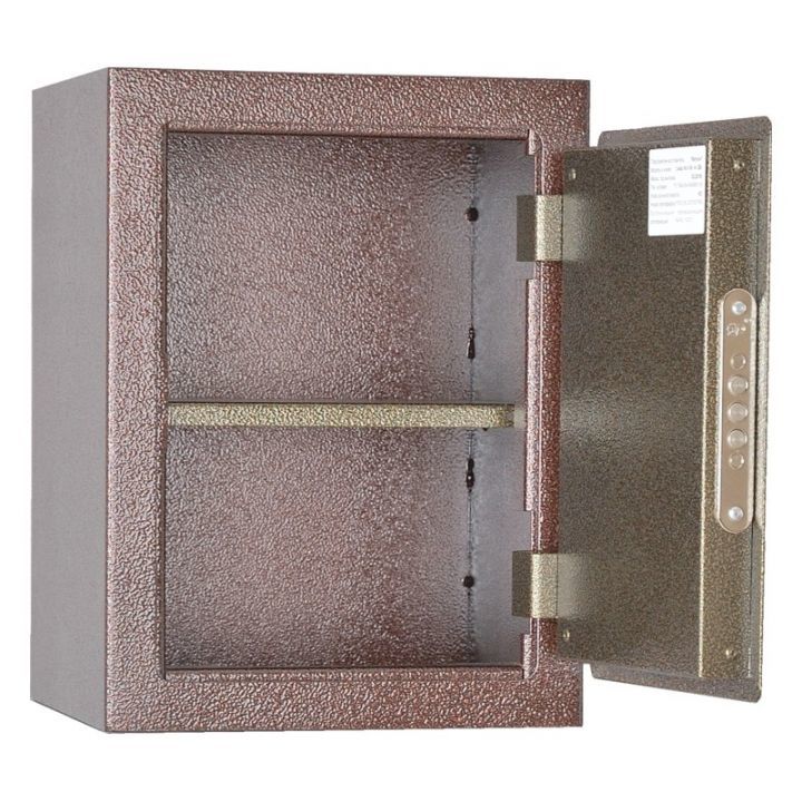 Корпус сейфа толщиной 2 мм, дверь толщиной 2 мм. На задней стенке корпуса расположены отверстия для крепления.