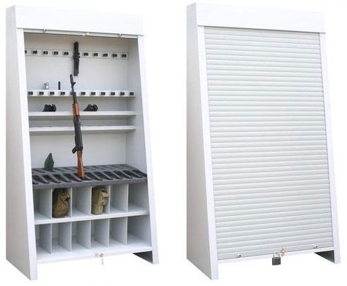 Шкаф оружейный предназначен для хранения оружия до 10 единиц.12 ячеек под боеприпасы, противогазы.Встроенные рольставни позволяют закрывать секции шкафа в двух положениях.Окрашен порошковой краской серого цвета.
