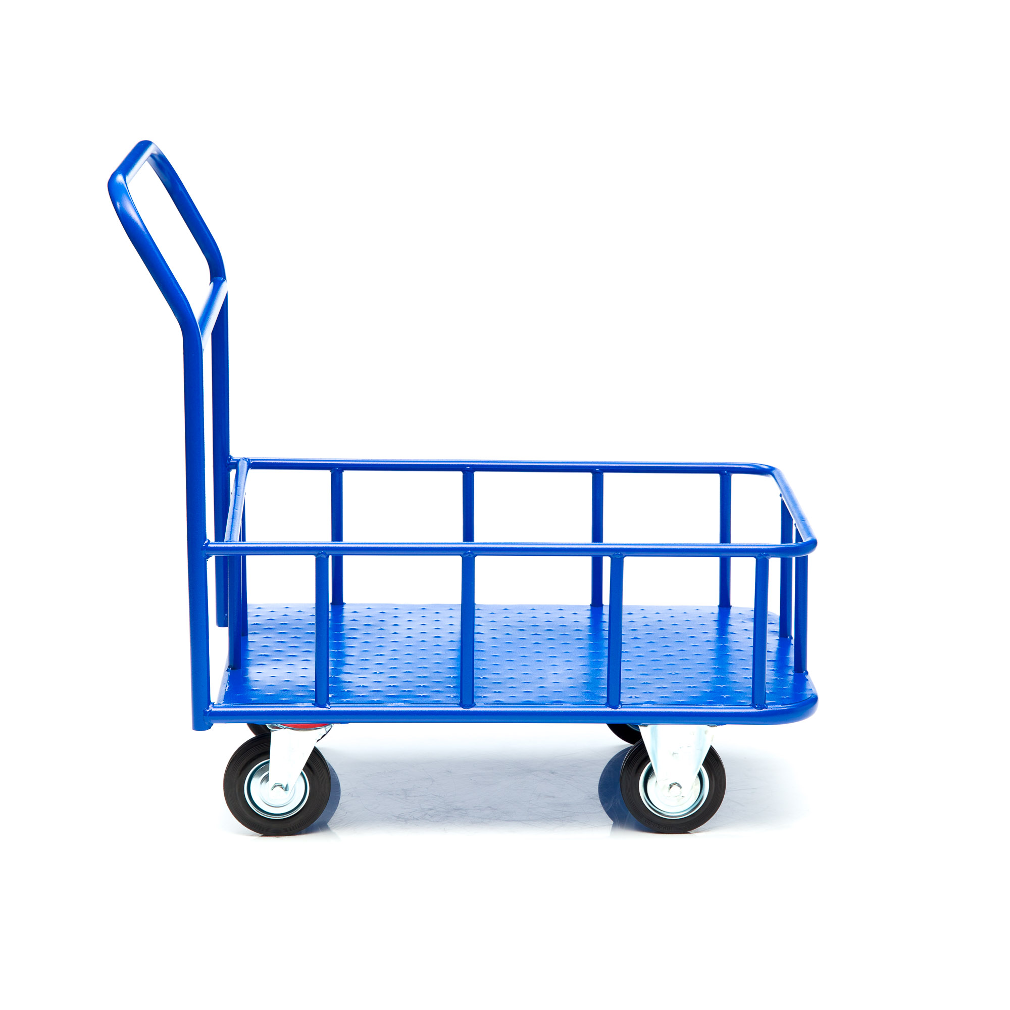 Платформенная 4-х колесная тележка КПБ-300 (с бортом) (600х900) используется для перемещения различных грузов, как в промышленности, так и в условиях склада или вокзала. Конструкция тележки цельносварная. Размер платформы 600х900мм., высота борта 150мм., высота ручки 750мм., Платформа имеет уникальную рельефную полимерную противоскользящую поверхность. Цвет синий, шагрень. Для легкого перемещения тележка КПБ-300 комплектуется 2 поворотными и 2 неповоротными колесами, изготовленными из высококачественной литой резины. Малые габариты, удобная ручка и поворотные колеса обеспечивают высокую мобильность средства, 4 точки опоры гарантируют устойчивость тележки, а наличие невысоких бортов гарантирует безопасность перевозимого хрупкого и мелкоштучного груза.