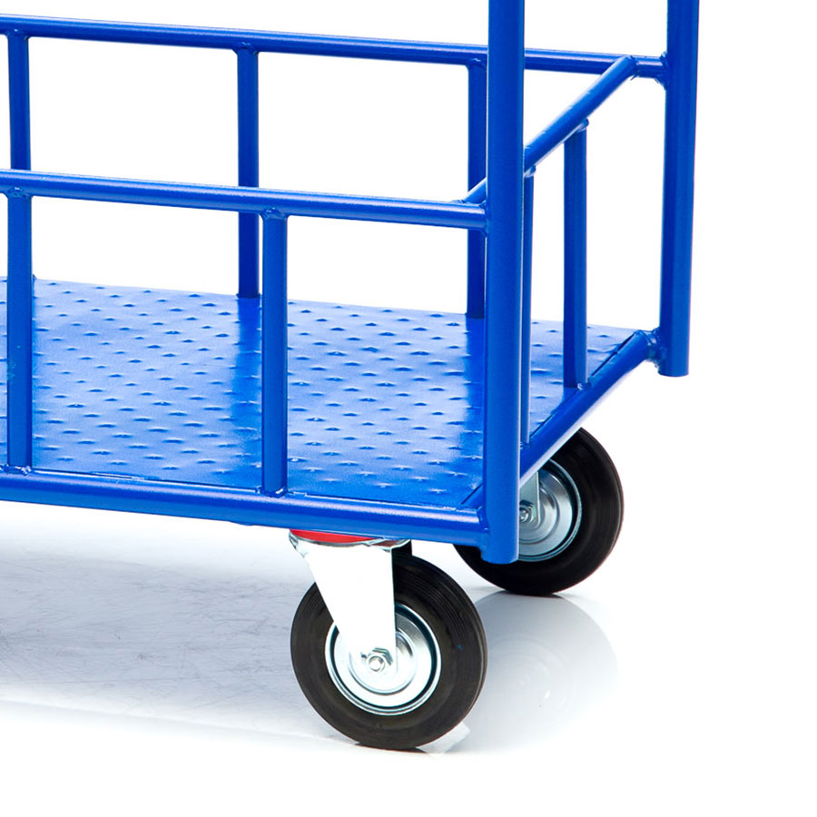 Платформенная 4-х колесная тележка КПБ-300-200-К (с бортом) используется для перемещения различных грузов, как в промышленности, так и в условиях склада или вокзала. Конструкция тележки цельносварная. Размер платформы 600х900 мм, высота борта 150 мм, высота ручки 750 мм. Платформа имеет уникальную рельефную полимерную противоскользящую поверхность. Цвет - синий, шагрень. Малые габариты, удобная ручка и поворотные колеса обеспечивают высокую мобильность средства, 4 точки опоры гарантируют устойчивость тележки, а наличие невысоких бортов гарантирует безопасность перевозимого хрупкого и мелкоштучного груза.