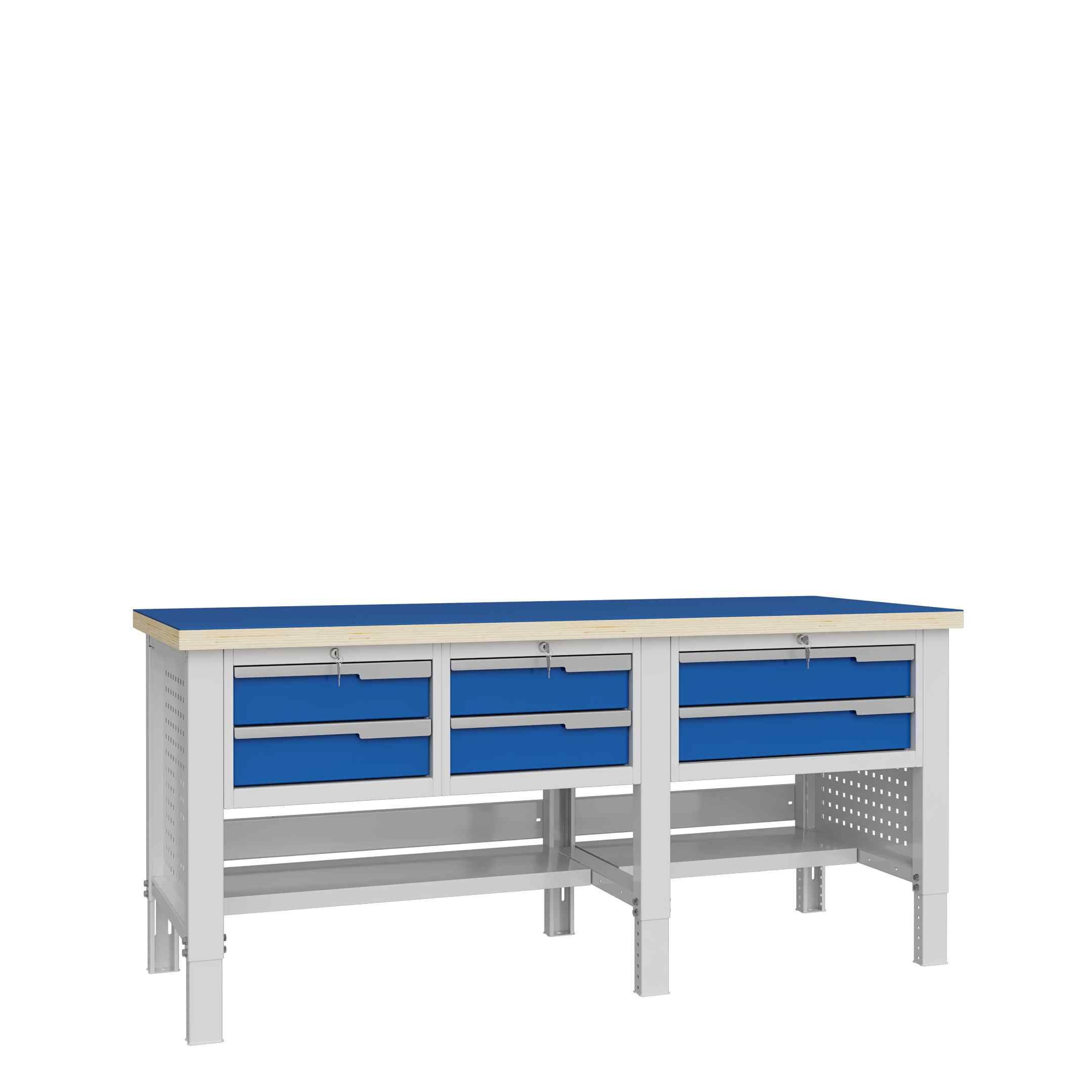Регулировка рабочего места по высоте осуществляется в диапазоне от 700 до 950мм с шагом 25мм. Предусмотрена возможность тонкой регулировки усиленным резьбовым подпятником. Нагрузка на ящики верстака - до 40 кг, на полки - до 60кг. Общая распределенная нагрузка на рабочую поверхность 1500кг. Имеет возможность стыковки в единую рабочую поверхность с верстаками серии Constructor