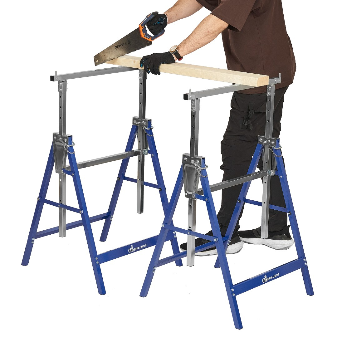 5-ти уровневая регулировка высоты опоры из оцинкованной стали может быть скорректирована в соответствии с потребностями и требованиями каждой конкретной работы от 800 до 1300 мм. Благодаря этой характеристике козлы строительные становятся идеальным выбором для любого проекта.