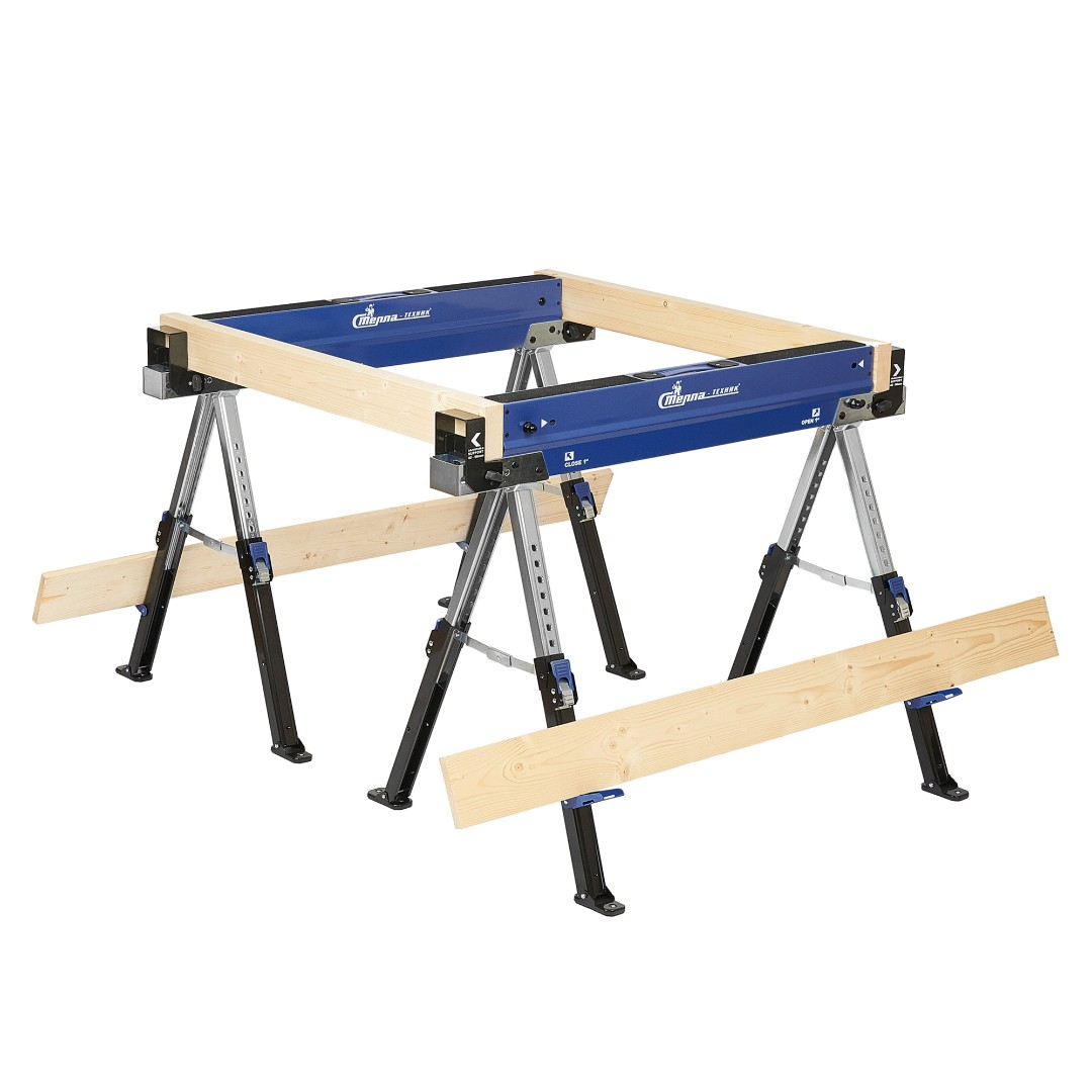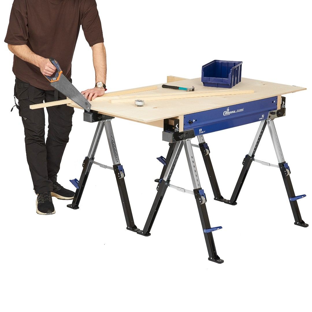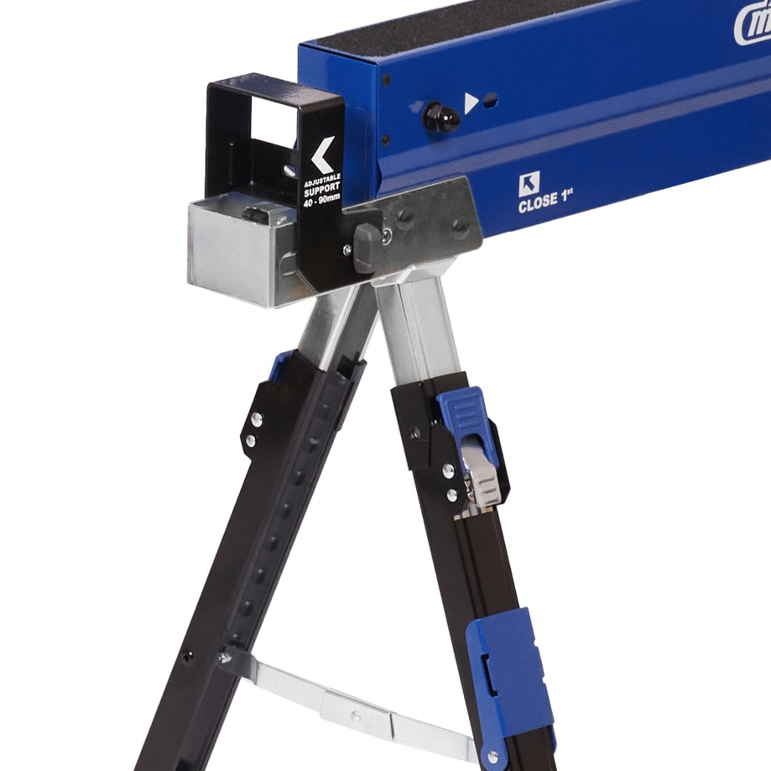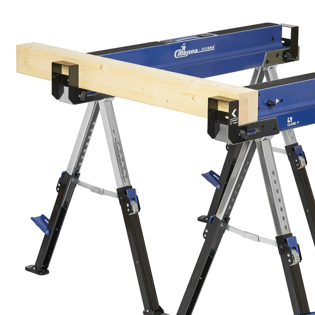 Складные козлы имеют 2 ложемента для распила длинномерного бруса или для установки связывающих брусьев размером 47x100 мм, что позволяет увеличить рабочую поверхность и обеспечивает жесткость конструкции рабочего места. Также включает в себя новаторские опоры для временного хранения и поддержки листового материала, которые дают возможность вертикальной фиксации и простого и быстрого раскроя листовых материалов.