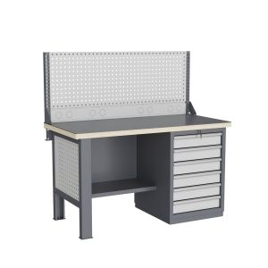 Верстак может комплектоваться одинарным или двойным перфорированным экраном, электромонтажным блоком для установки розеток и дополнительных устройств, а также комплектом освещения с держателем и лампой. Перфорация экрана подходит под стандартные держатели для инструментов, отверток, крючков, полок. Возможна комплектование верстака навесным элементами (держатели, крючки, полки).