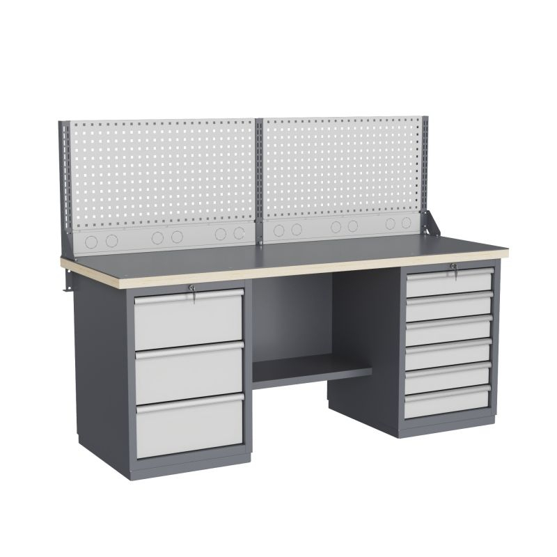 Верстак может комплектоваться одинарным или двойным перфорированным экраном, электромонтажным блоком для установки розеток и дополнительных устройств, а также комплектом освещения с держателем и лампой. Перфорация экрана подходит под стандартные держатели для инструментов, отверток, крючков, полок. Возможна комплектование верстака навесным элементами (держатели, крючки, полки).